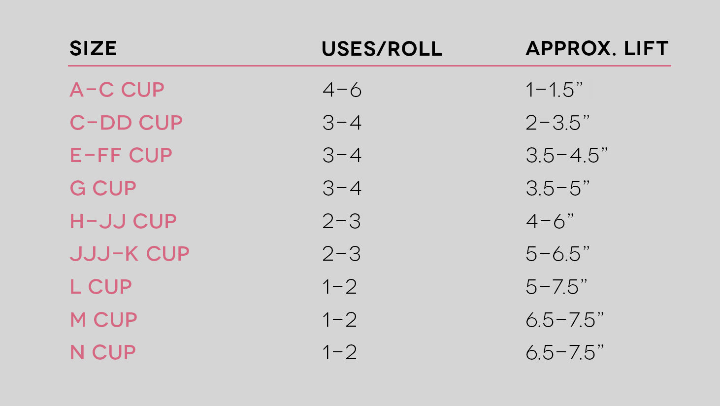 One roll of Bra-less Bra can be used up to five times. (See size chart)